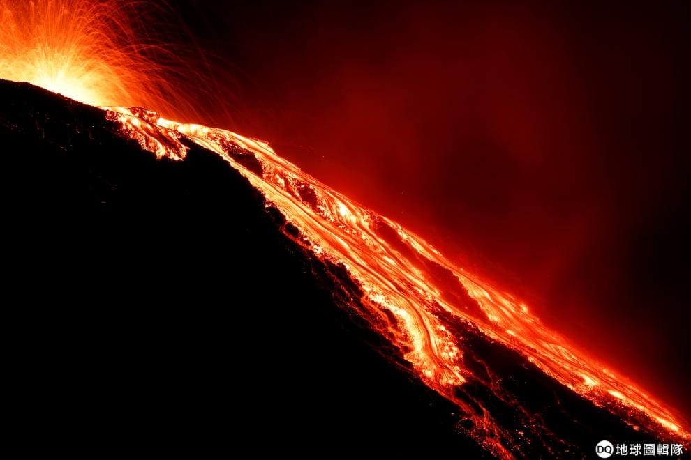 在義大利西邊的火山島斯特龍伯利島(island of Stromboli),島上的火山在近日爆發,流出汩汩岩漿,在暗夜中特別顯眼。