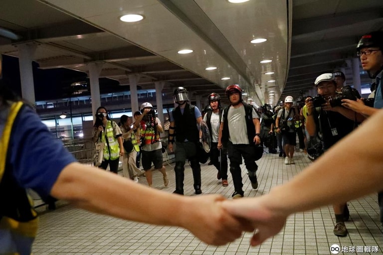 示威者手牽著手,想要阻止便衣警察進入地鐵站。