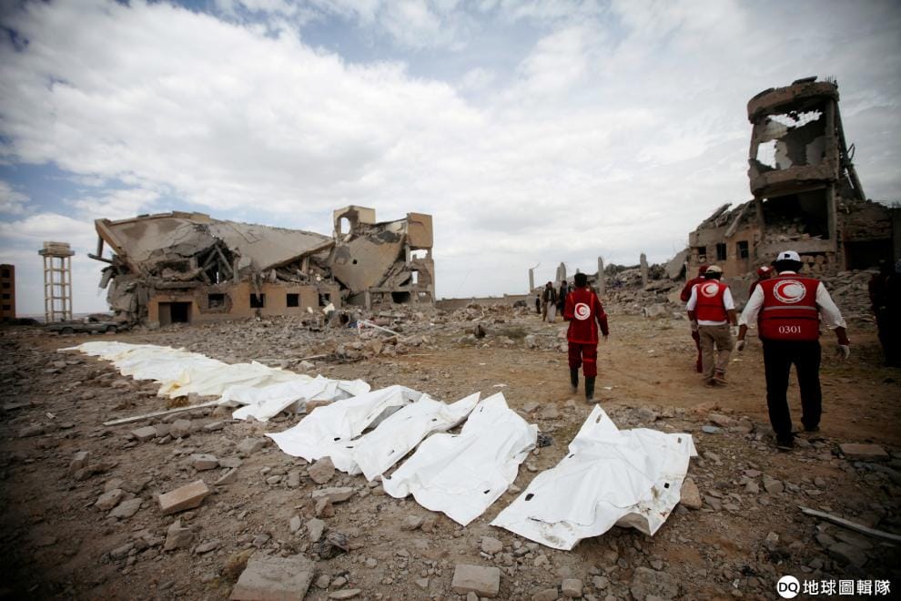 在城市扎瑪爾(Dhamar),國際紅十字(ICRC)組織的成員走過好幾具受害者的遺體,這些人是受到沙烏地阿拉伯領導的空襲波及而死亡。