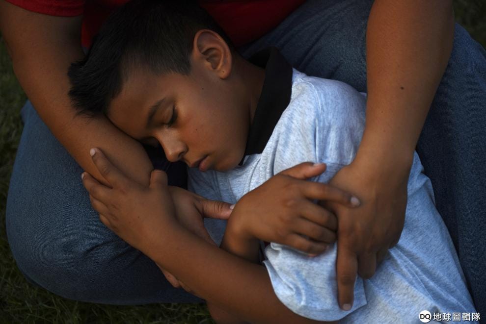 在守夜活動上,一名小男孩疲倦地在媽媽腿上睡著了。