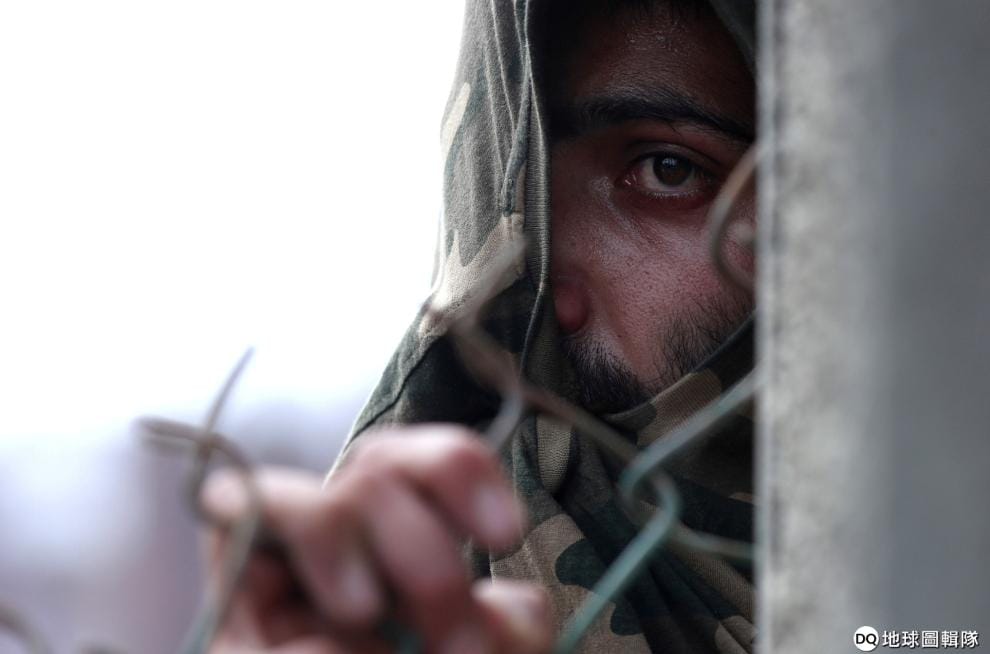在與印度國家安全衛隊發生衝突後,一名喀什米爾男子以障礙物為掩護,密切關注畫面另一端的動向。