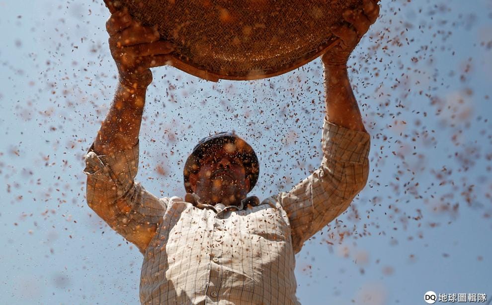 一名農夫忙著篩選芝麻,要把篩過的良品帶到市場去賣。