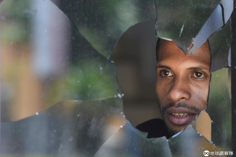 來到印尼巴布亞區(Papua),在發生暴力示威之後,一名男子躲在破掉的窗戶後面觀望著。