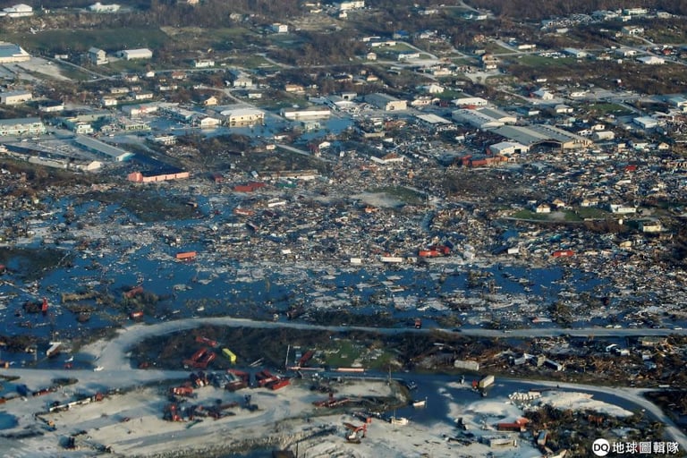 在這張空拍圖裡,記錄下颶風多利安(Dorian)肆虐的痕跡。被列為最高等級 5級的颶風多利安在登陸巴哈馬後帶來嚴重災情,到處都可以看到被破壞的樹木、電線桿、民宅、船隻,街區也因而淹水。