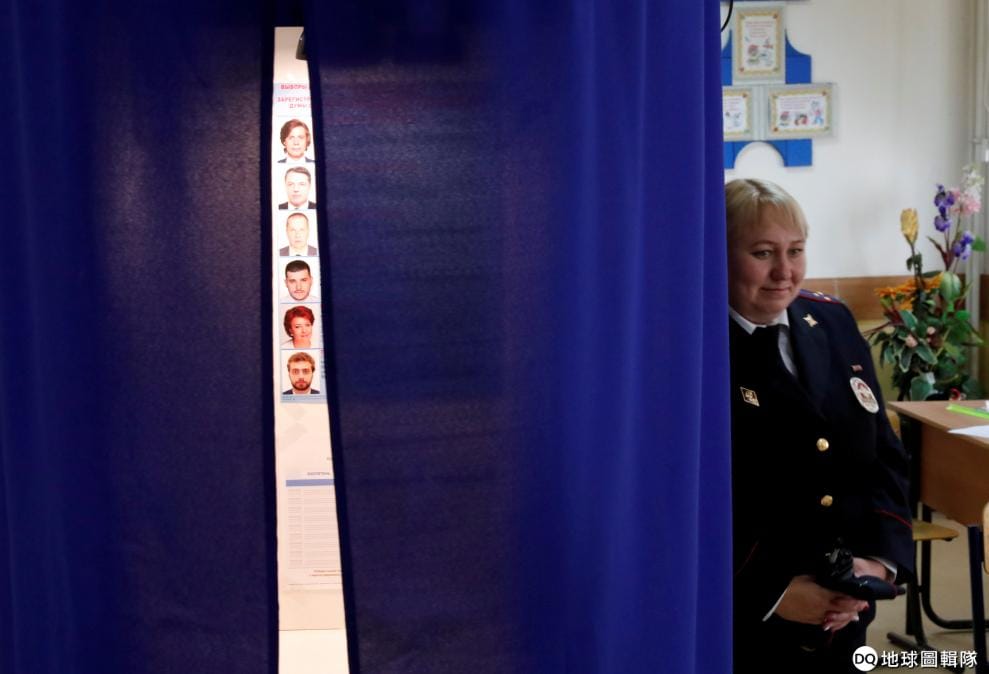 一名警察站在莫斯科的投票所內維持秩序,當地正在舉辦莫斯科市議會投票。