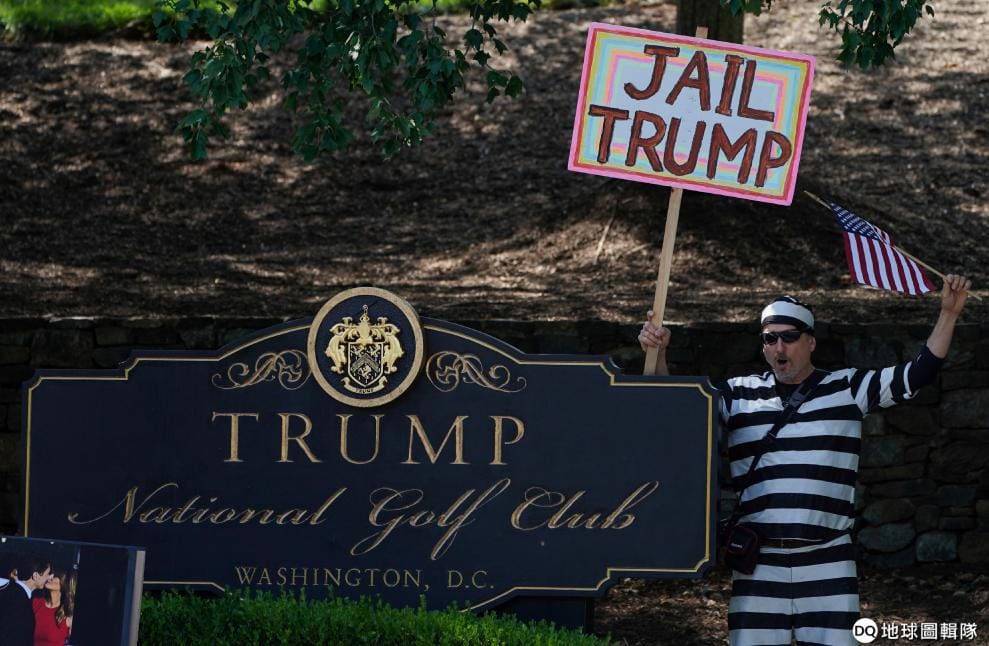示威者趁著美國總統川普(Donald Trump)到俱樂部打高爾夫球的時候,高舉著示威標語抗議,在畫面另一端,也有挺川普的示威者到現場表達自己的意見。