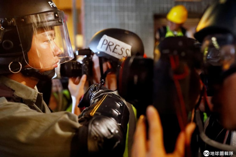 在靠近旺角警署的地方,警察朝示威者的方向警戒著,記者們則忙著把現場畫面捕捉下來。