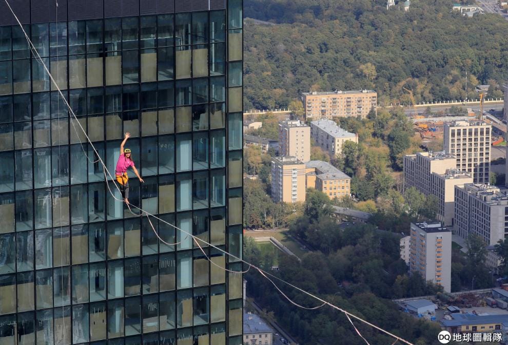 一名走繩索好手穿梭在莫斯科國際商業中心的建築群之間,這裡因為摩天大樓林立,也有著「莫斯科城」(Moskva-City)之稱。