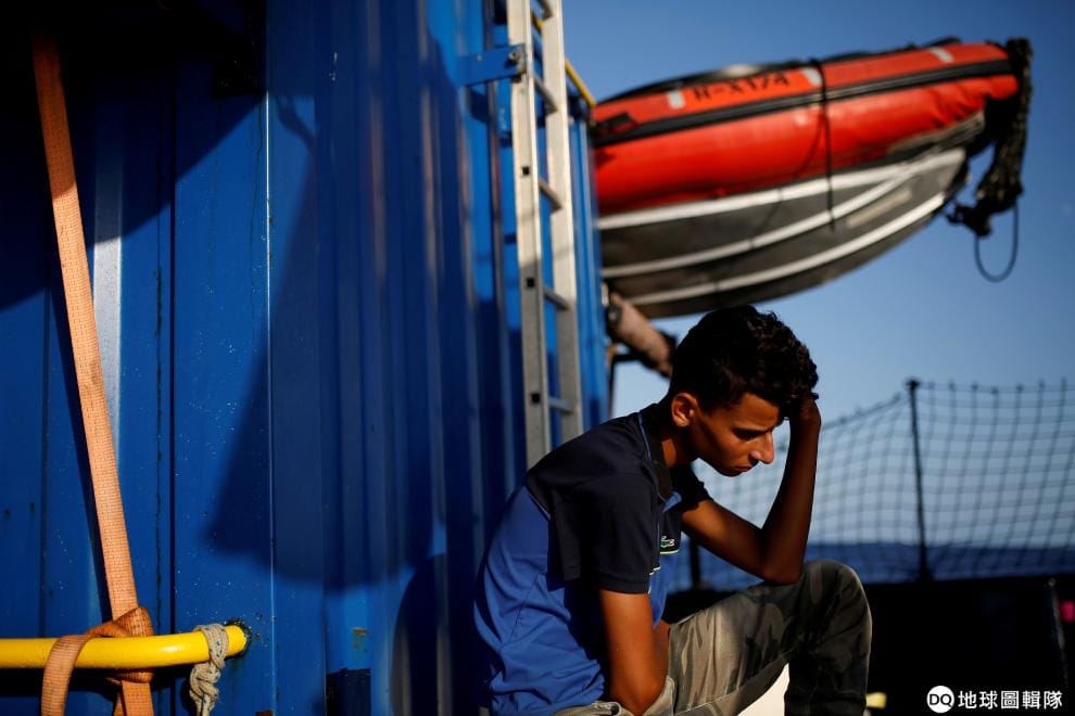 一名突尼西亞移民坐在德國非政府組織「海洋之眼」(Sea-Eye)的移民救援船上,這艘船將會將他們送到馬爾他。