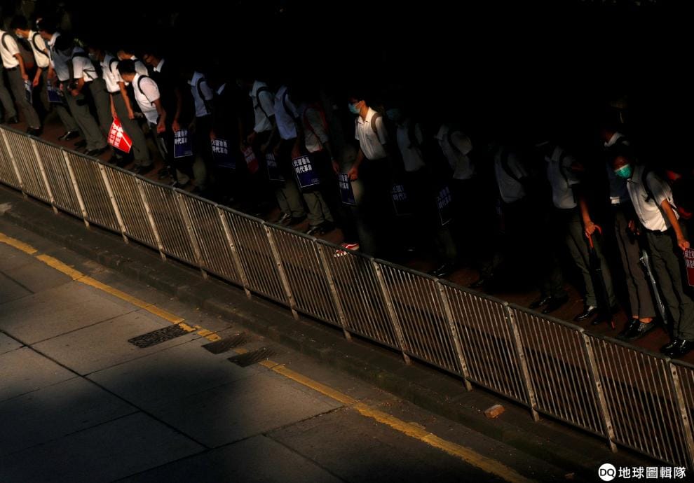 在香港街頭,中學生手牽著手組成人牆站在街頭,抗議這一陣子,香港警察暴力鎮壓示威者的情況。