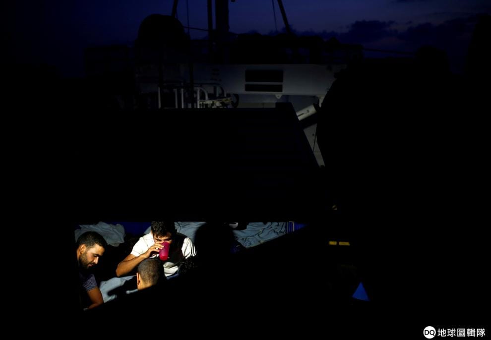 在德國非政府組織「海洋之眼」(Sea-Eye)的移民救援船上,一群來自突尼西亞的移民用著餐,他們正在前往馬爾他的路上。