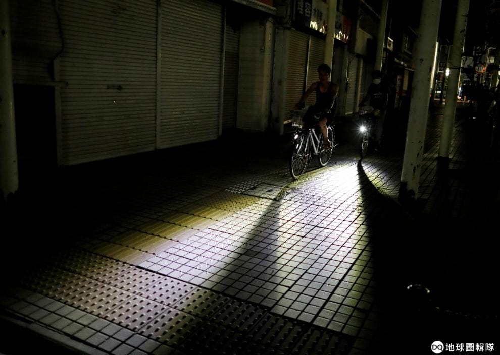 人們騎著腳踏車穿越因為停電而一片漆黑的街區。在強颱法西(Faxai)襲擊日本後,因為前往東京成田機場的高速巴士、鐵路停駛,使得旅客只能透過自用車或計程車來往,造成超過 1萬名旅客因此受困機場。