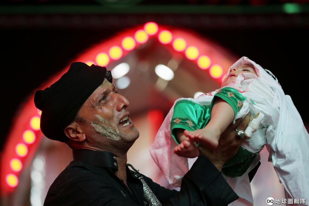 一名什葉派穆斯林信徒高舉著嬰兒,要和他一起參加「穆哈蘭月」(Muharram)傳統儀式。