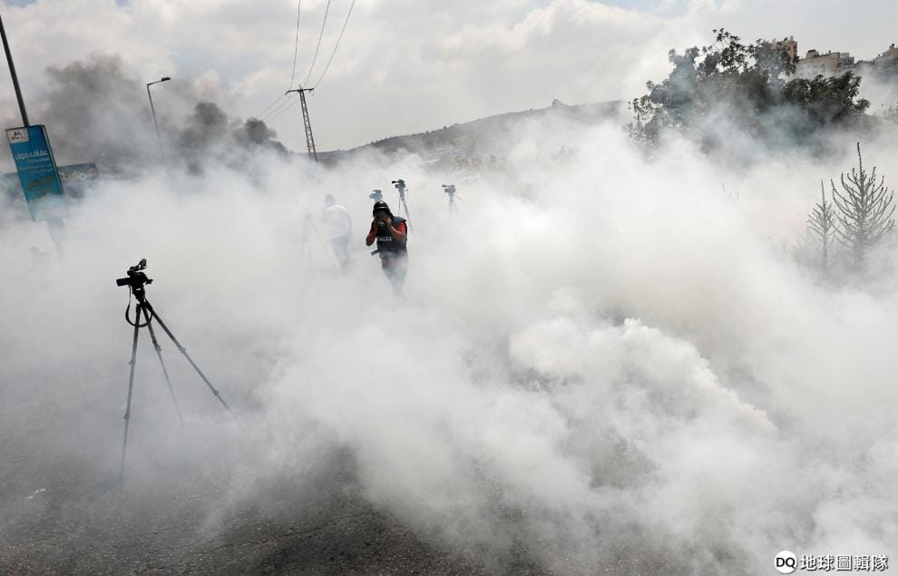 以色列武力部隊朝示威的巴勒斯坦人發射催淚彈,讓在示威現場的記者因而倉皇走避。