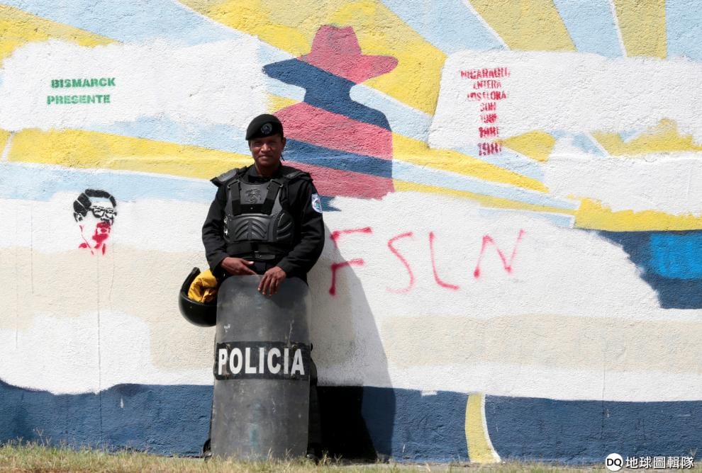 在反對尼加拉瓜總統奧蒂嘉(Daniel Ortega)的示威遊行上,一名鎮暴警察在旁邊警戒著。