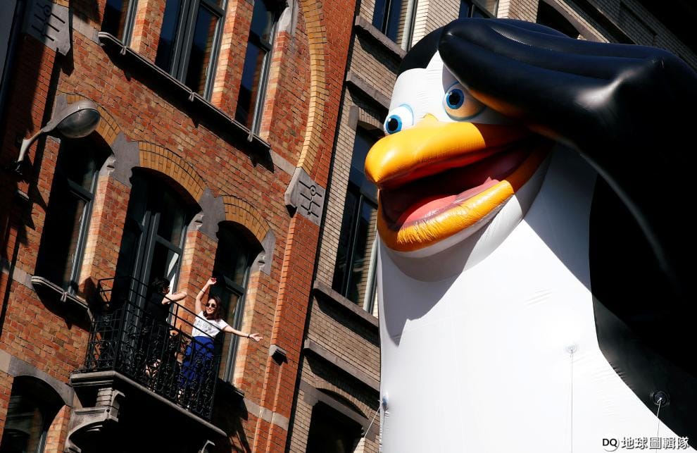 15號這天,首都布魯塞爾舉辦了氣球日大遊行,主要街道上可以看到各種大型卡通造型氣球,圖中來自卡通《馬達加斯加》(Madagascar)的企鵝就是其中之一。
