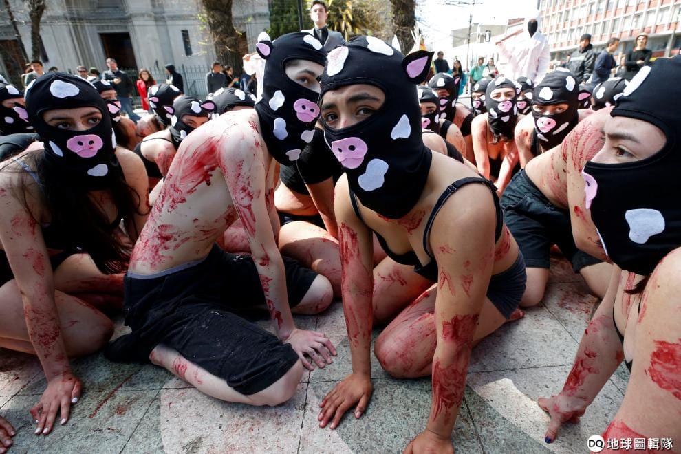 在智利的立法首都瓦爾帕萊索(Valparaíso),提倡動保和素食的組織成員打扮成牛的模樣,趴在地上呼籲大眾不要吃肉。