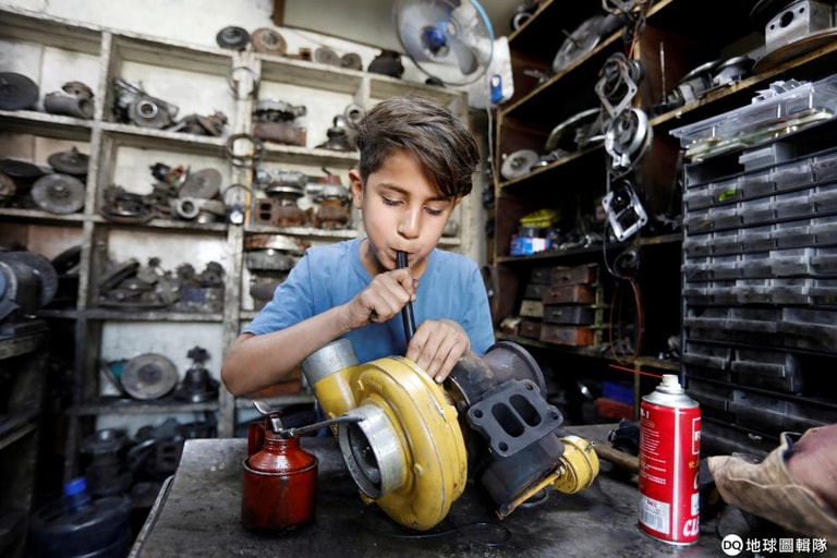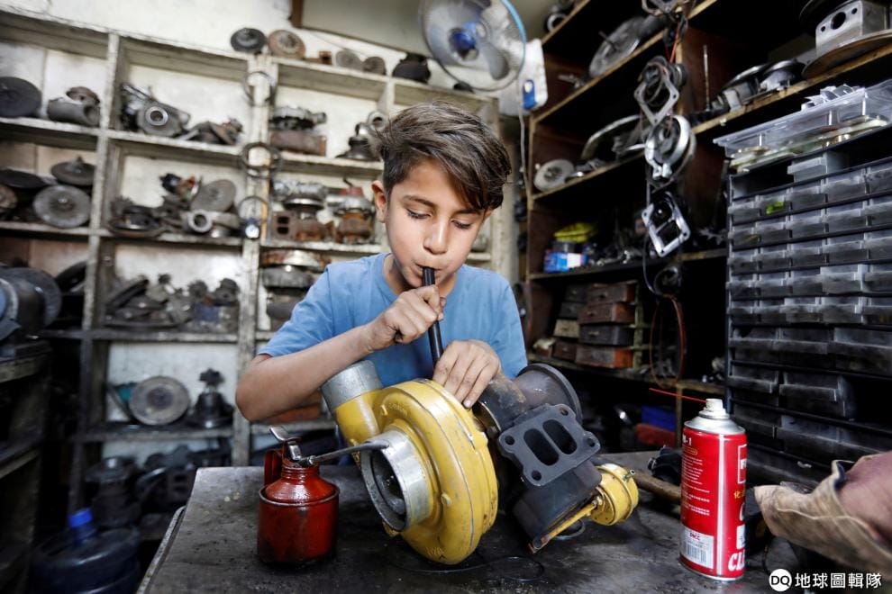 在首都巴格達的一間汽車修理廠內,今年 10歲的朱默(Hussein Adel Jumah)已經可以獨當一面幫客人修東西。