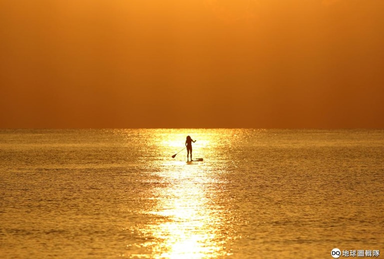 在位於東部海岸的拉納卡市(Larnaca),一名女子在日出時玩著立槳衝浪,太陽上升時迸射的光線將天空和海面染成了金黃色。