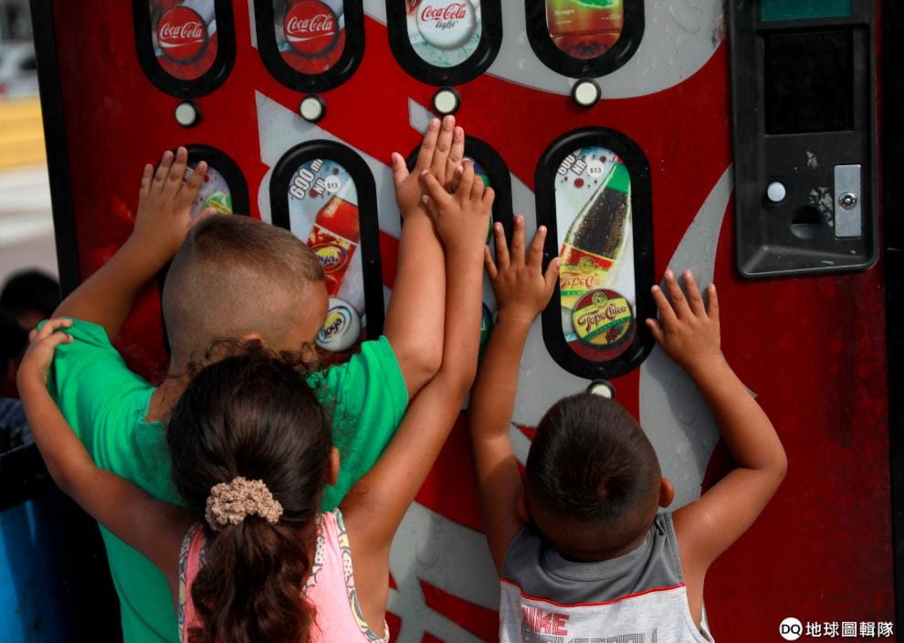 在美墨邊界的馬塔莫羅斯市(Matamoros),等待向美國尋求庇護的中美洲移民孩童拍打眼前的自動販賣機玩耍。