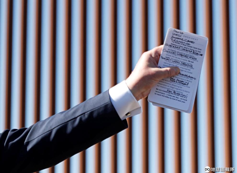 在位於美墨邊境的加州奧塔伊梅薩(Otay Mesa)社區,美國總統川普(Donald Trump)前來視察邊界圍牆,他也舉起了演講要用的小抄給大家看。