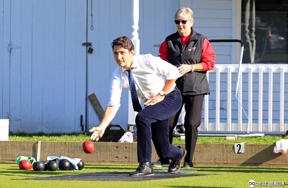 在新伯倫瑞克省(New Brunswick)的首府弗雷德里克頓(Fredericton),加拿大總理杜魯道(Justin Trudeau)正在和當地的草地保齡球俱樂部會員同樂。