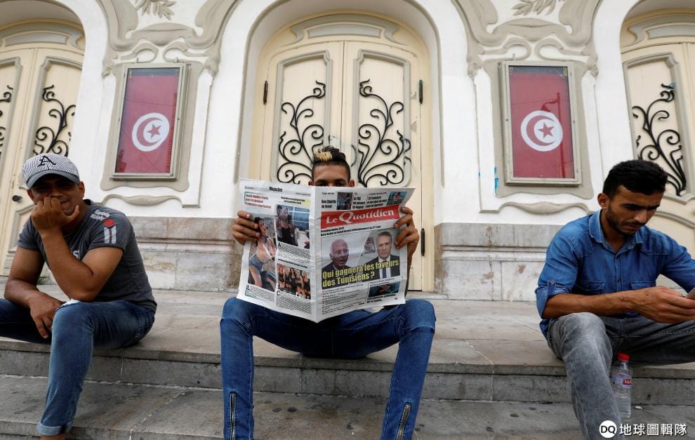 在首都突尼斯(Tunis),一名男子的報紙上出現了兩大總統候選人的照片。因為第一輪總統大選沒有任何一位候選人拿到過半票數,所以突尼西亞即將舉行第二輪總統大選,由在第一輪大選中領先的前兩名候選人參選,他們分別是今年 61歲、無黨籍的法律學教授薩伊德(Kais Saied)和今年 56歲、被關在牢中的媒體大亨卡魯伊(Nabil Karoui)。這次的總統大選也是突尼西亞繼引發阿拉伯之春的茉莉花革命後,第二次民選總統。