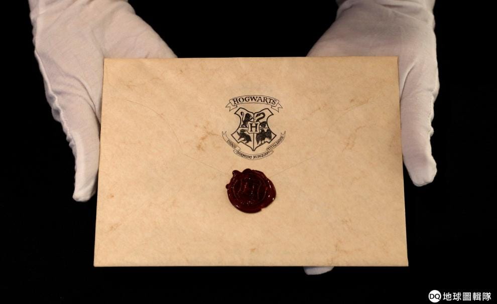 在倫敦電影和電視紀念品特賣會前,工作人員手捧著出現在 2001年的電影《哈利波特:神秘的魔法石》中的霍格華茲(Hogwart)魔法學校入學信。