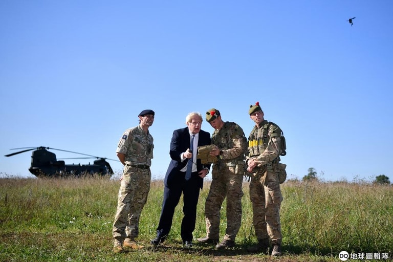 在索爾茲伯里軍事訓練場上,英國首相強生(Boris Johnson)正在操控黑色大黃蜂無人機。