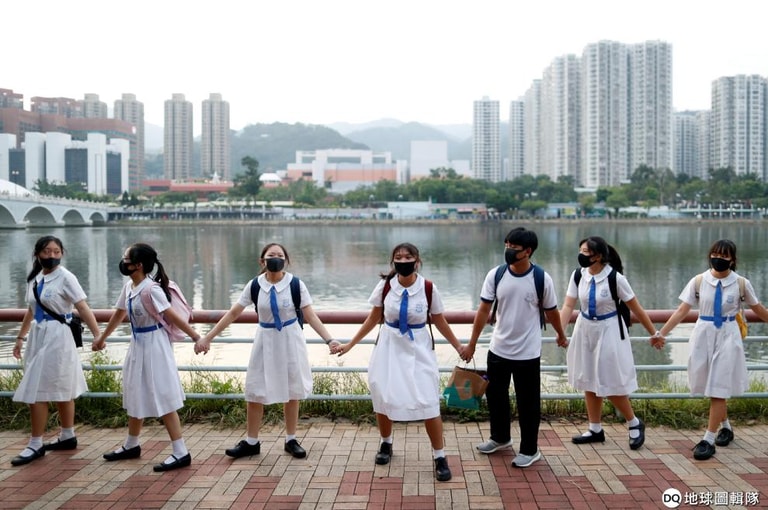 在香港新界沙田區的城門河旁,反政府的示威學生手拉著手形成人鏈,表達人民自決的訴求。