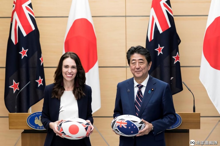 為了 20號在東京登場的世界盃橄欖球賽(Rugby World Cup),紐西蘭總理阿爾登(Jacinda Ardern)出訪日本,並且與日本首相安倍晉三交換印有兩國國旗的橄欖球。