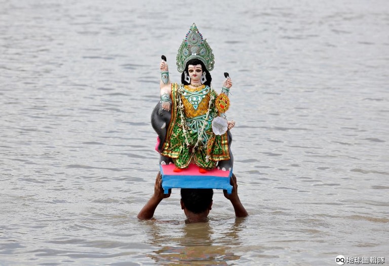 在加爾各答,一名印度教信徒抬著在維什沃卡瑪(Vishwakarma)的神像,準備將祂浸泡到恆河中求好運。維什沃卡瑪被視為印度創世神、建築之神,祂也替諸神製造了各式各樣神話般的武器。