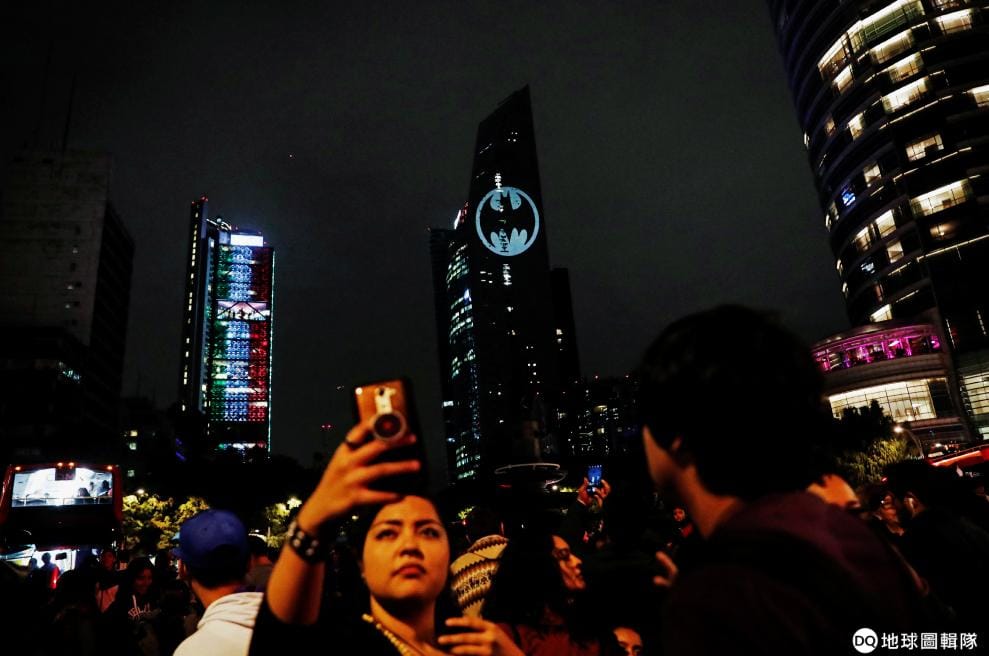 在墨西哥市,一棟建築物的外牆被投影上了蝙蝠俠的標誌,紀念這名超級英雄出現在DC漫畫公司的漫畫中已經八十年了。