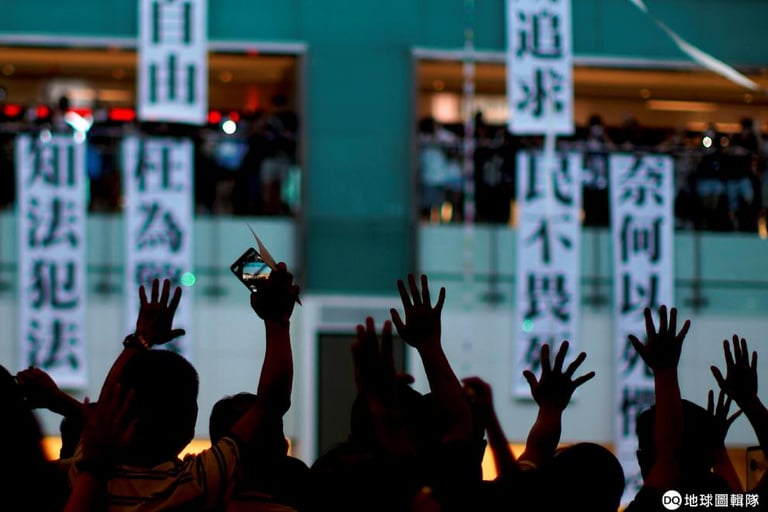 在沙田區的一間購物商場內,反政府的示威民眾放下白色布條,上頭寫著為了追求自由民主、不害怕死亡的字句,展現爭取民主的決心。