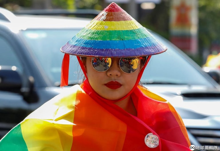 22號這天,首都河內舉辦了LGBT大遊行,一名女子身披彩虹旗、頭戴彩虹斗笠參加活動。