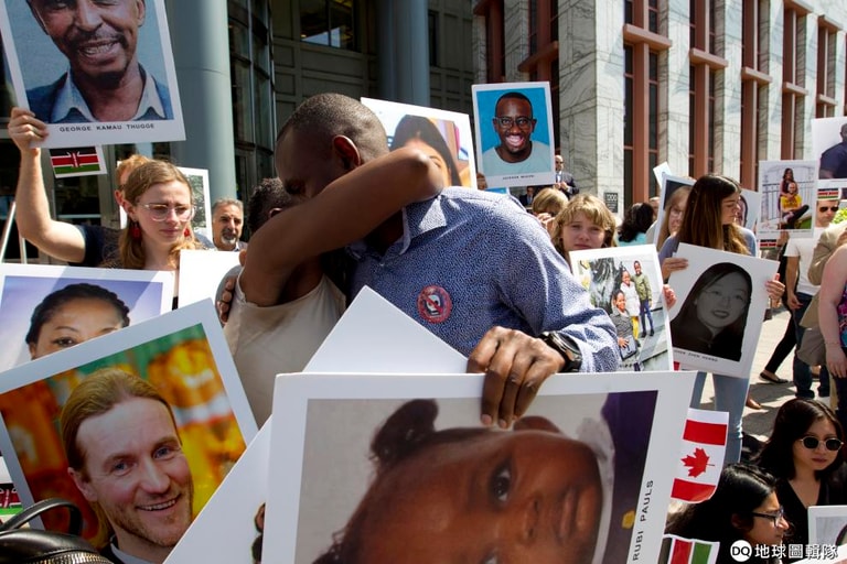 在這場會議上,空難罹難者家屬奈洛吉(Paul Njoroge)和莫爾(Chris Moore)拿著親人的照片坐在外頭抗議。前者失去了妻子、三名小孩、岳母;後者則失去了女兒。