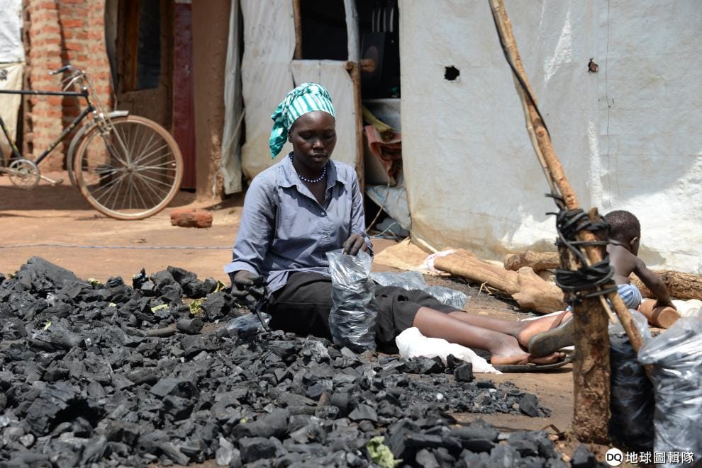 烏干達人阿里(Dawa Alli)坐在Bidi Bidi裡,以塑膠袋販售袋裝煤礦。