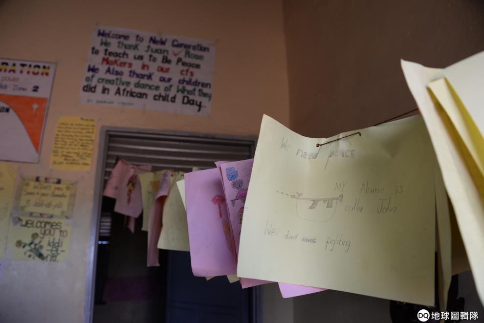 在世界展望會於Bidi Bidi設立的兒童中心裡,孩子們在紙卡上寫著:「我們需要和平。我叫做約翰。我們不想要戰爭。」