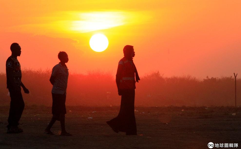 幾名南蘇丹人走在難民營之間,與日落美景相互輝映。