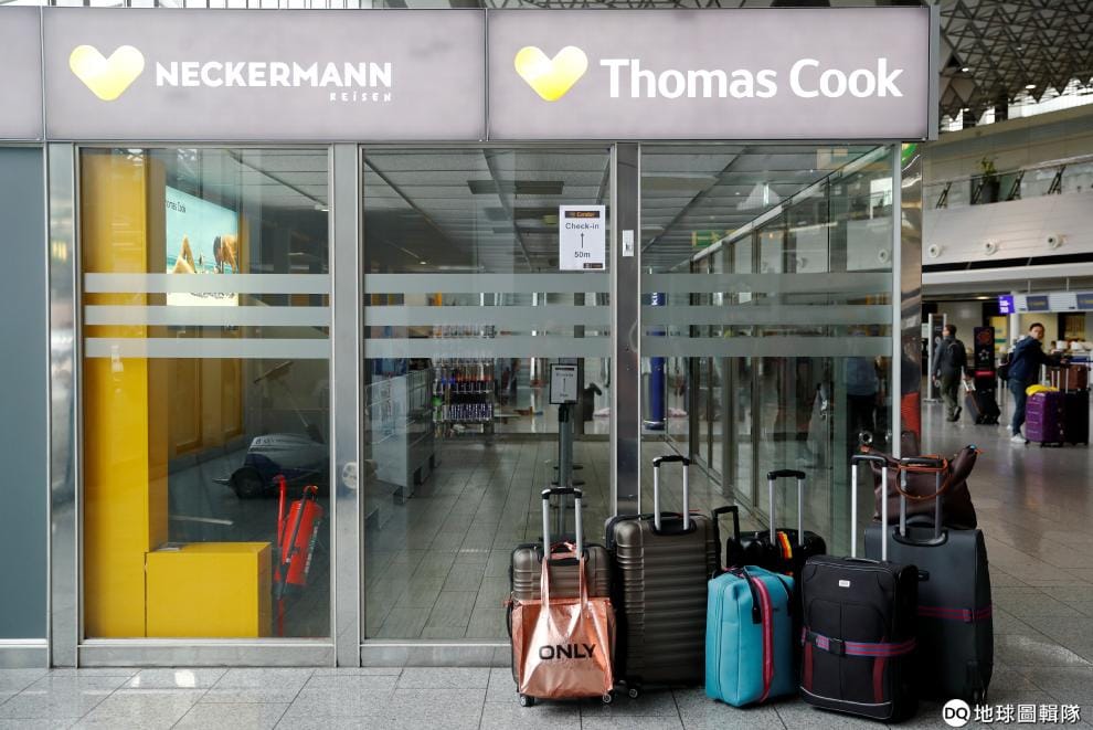 在法蘭克福機場(Frankfurt Airport),英國百年旅行社Thomas Cook的櫃台被封了起來,一旁堆放著旅客的行李。