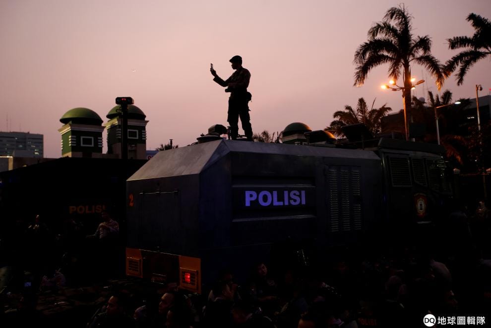 在首都雅加達的印尼國會建築外,一名警察站在警車上用手機把抗議的大學生全數拍下。