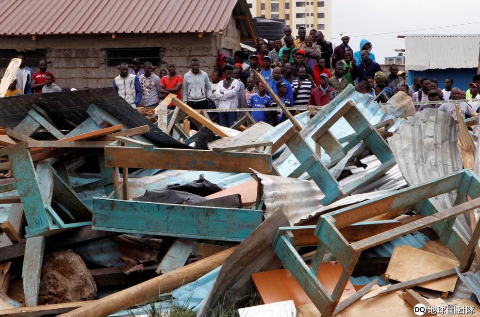 在首都奈洛比的一間學校內,師生們看著倒塌的教室。23號早上,一間教室的天花板應聲崩塌,當場壓死 7名學生,並且造成 64名學生受傷。