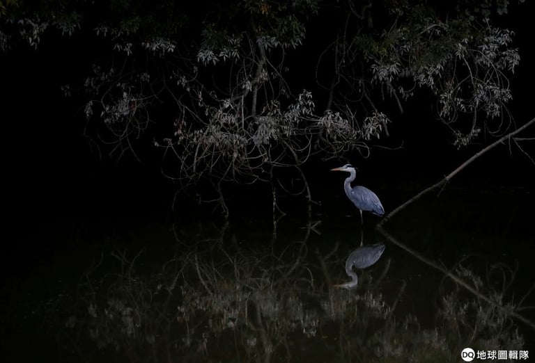 在法國西北部的塞雷斯河(Sevres river),一隻鷺靜靜地站在河中。