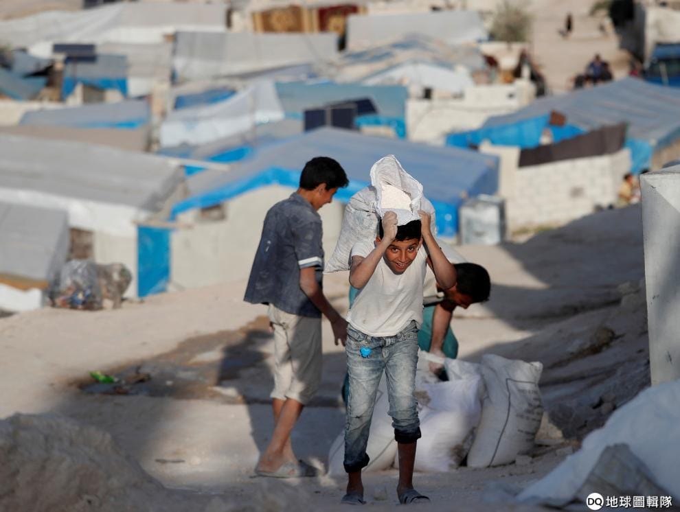 在緊鄰土耳其邊界的Atmah難民營,飽受戰火摧殘的孩子們正在搬東西。