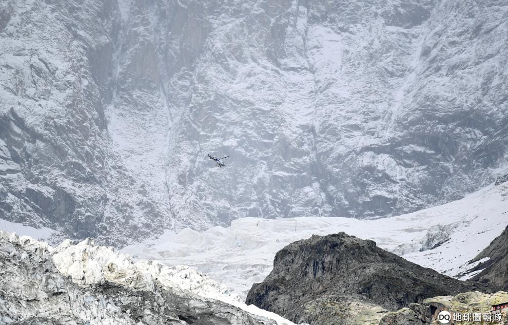 在緊鄰阿爾卑斯山的奧斯塔市(Aosta),一架直升機飛過因為全球暖化而有崩塌風險的Planpincieux冰河。