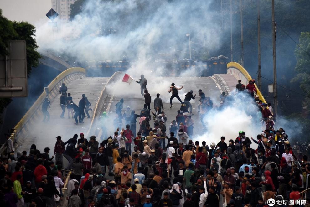在首都雅加達街頭,上萬名抗議學生和鎮暴警察發生衝突,現場充滿鎮暴警察發射的催淚瓦斯煙霧。