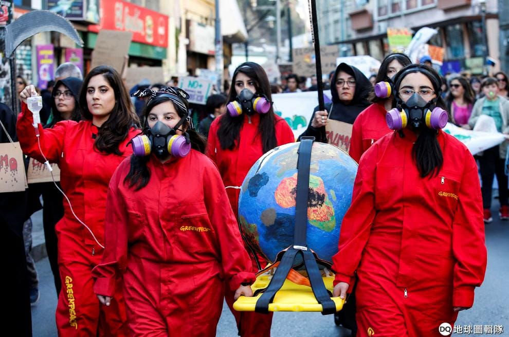 在即將召開 2019聯合國氣候變遷會議的瓦爾帕萊索(Valparaiso)市,綠色和平組織的成員打扮成救護人員的樣子,扛著擔架上受了傷的地球,參加每周五舉辦的「Fridays For Future」氣候變遷抗議活動。