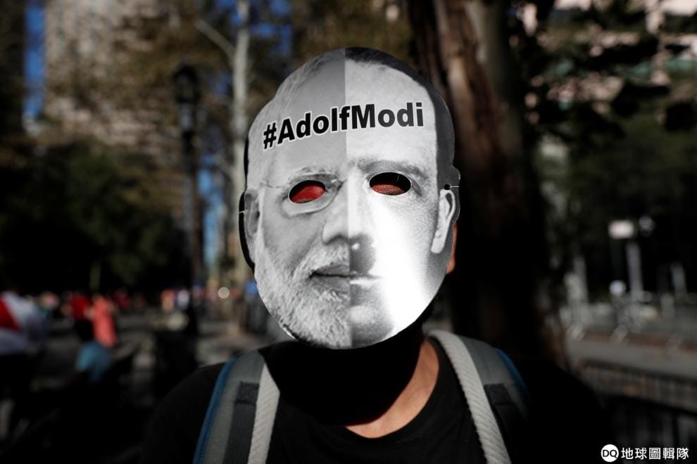在位於紐約的聯合國總部外,抗議民眾戴著一半是印度總理莫迪(Narendra Modi),一半是納粹德國領導人希特勒(Adolf Hitler)的面具,聲援住在印度喀什米爾自治區的人民。