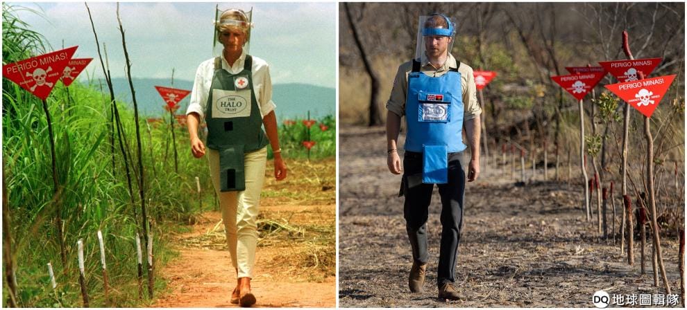 照片中左方是 1997年踩在中非安哥拉地雷殘存區的已故威爾斯王妃黛安娜(Diana, Princess of Wales),右方則是她的兒子英國薩塞克斯公爵哈利(Harry),這兩幅畫面相差了 12年。