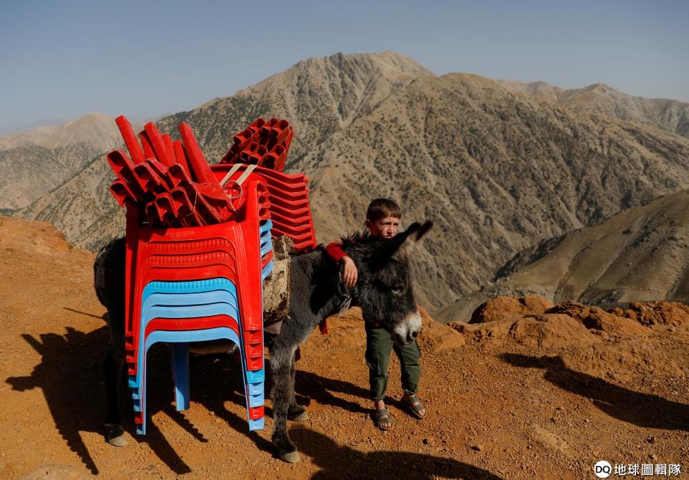 在交通不便的潘傑希爾省(Panjshir province),一名小男孩引領著一隻揹著塑膠椅的驢子,準備前往山區裡頭的投票所迎接總統大選。